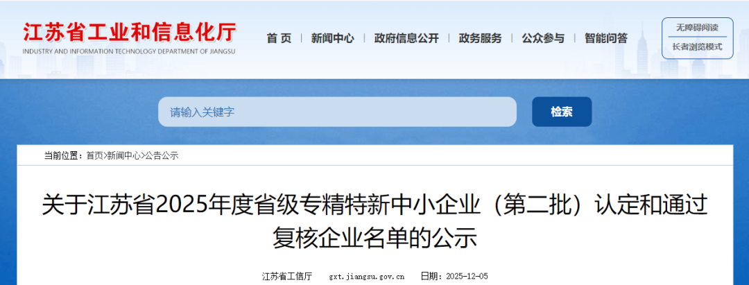 近日,江苏省工业和信息化厅公布,2025年度省级专精特新中小企业(第二批)认定和通过复核企业名单,我公司凭借在管式动力电池的专业、突破和创新,成功通过复核认定,再次获评2025年江苏省“专精特新”中小企业称号。